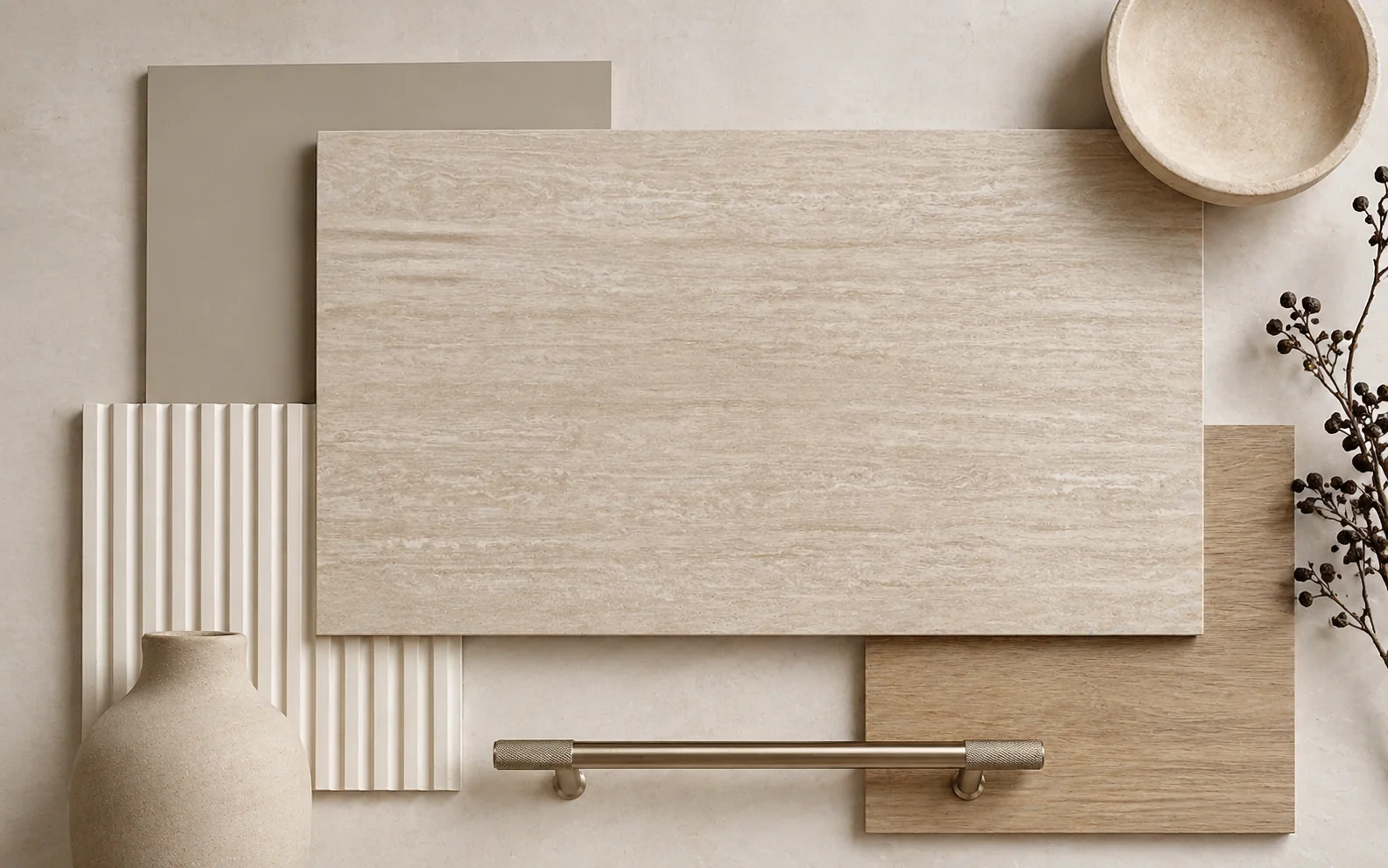 El Cream Travertine es la lectura más cálida de la colección 3D. Sus vetas dibujan caminos largos y suaves sobre un fondo limpio, casi cristalino. Una piedra que aporta luz sin perder presencia — para cocinas que se viven, baños donde se busca calma, mesadas que se vuelven el centro silencioso de la casa.