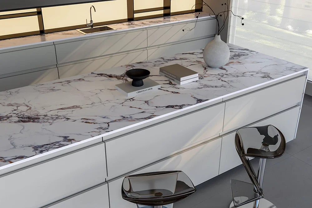 El Classic Bulgar es la lectura más cálida de la colección Fullbody. Sus vetas dibujan caminos largos y suaves sobre un fondo limpio, casi cristalino. Una piedra que aporta luz sin perder presencia — para cocinas que se viven, baños donde se busca calma, mesadas que se vuelven el centro silencioso de la casa.